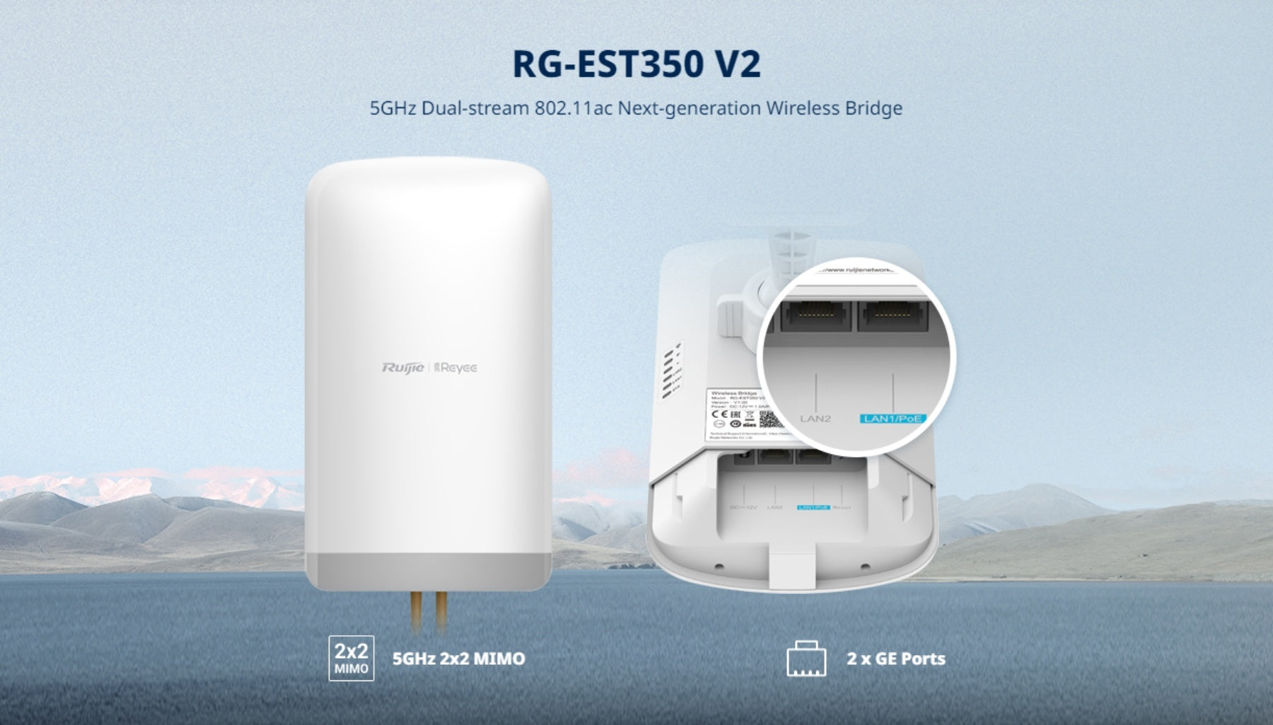 The Ruijie Reyee RG-EST350 (V2) is designed to effortlessly transmit data over distances of up to 5 km in real time. This high-performance wireless bridge utilises advanced Wi-Fi 5 technology (IEEE 802.11ac, Wave2) to deliver reliable connectivity, making it an ideal solution for various applications, including remote surveillance and data transfer.